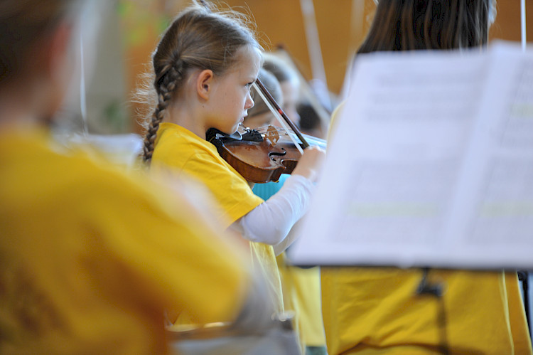 Gemeinsam mit Violinen, Violen und Celli kann von Anfang an in der Fiedelmäuse-Gruppe musiziert werden.